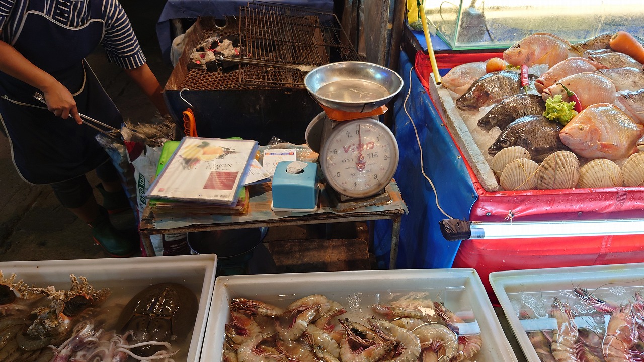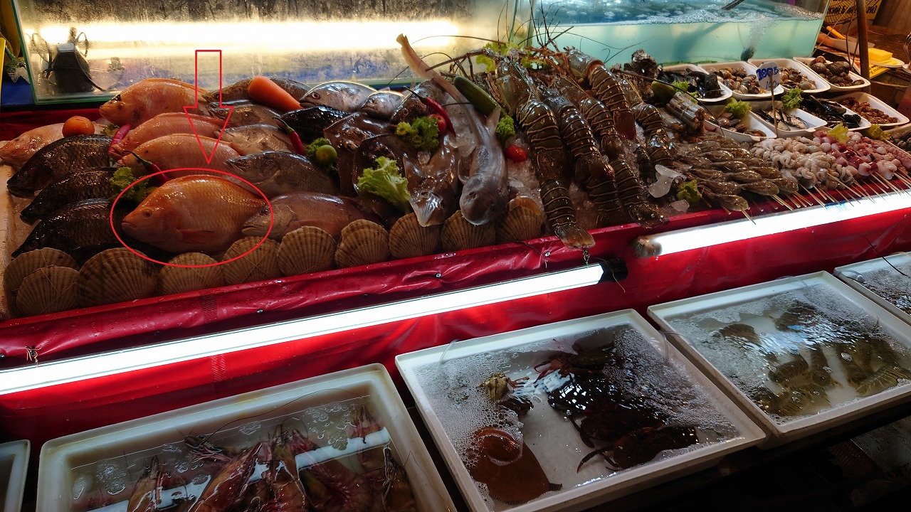 夜限定ですが、暑い中でお魚が並んでいます。(下に氷有り)