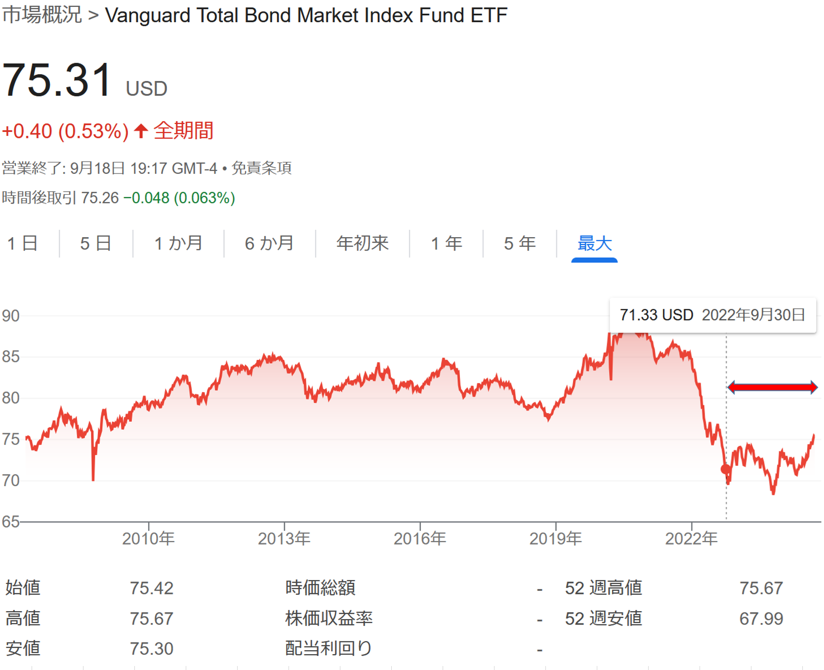 BNDの最大チャート。赤矢印が今回の積み立て期間です。