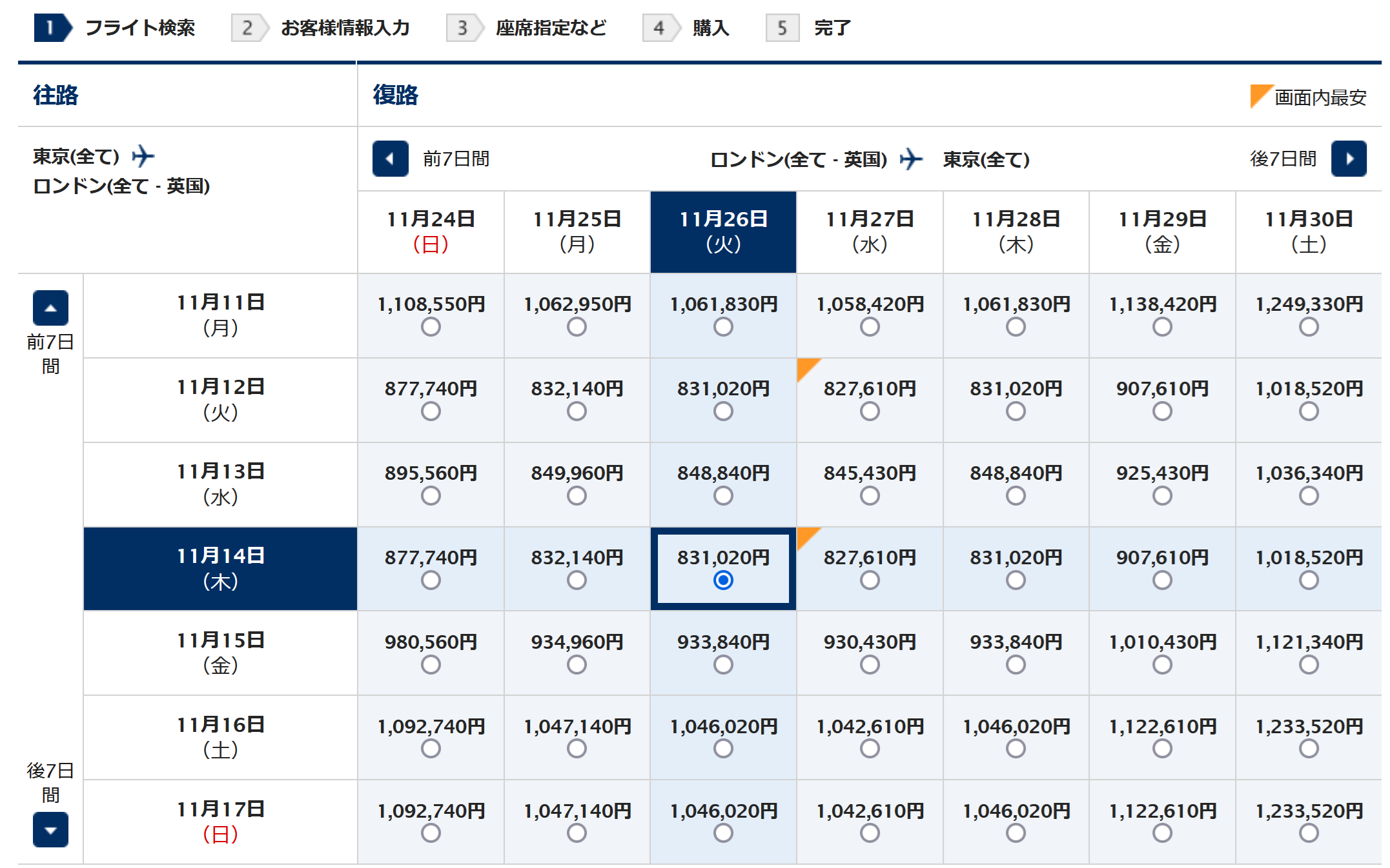 表示上は831,020円ですが、これは乗り継ぎ有りの他社便最安値でアップグレード対象ではありませんので対象の航空券を購入。