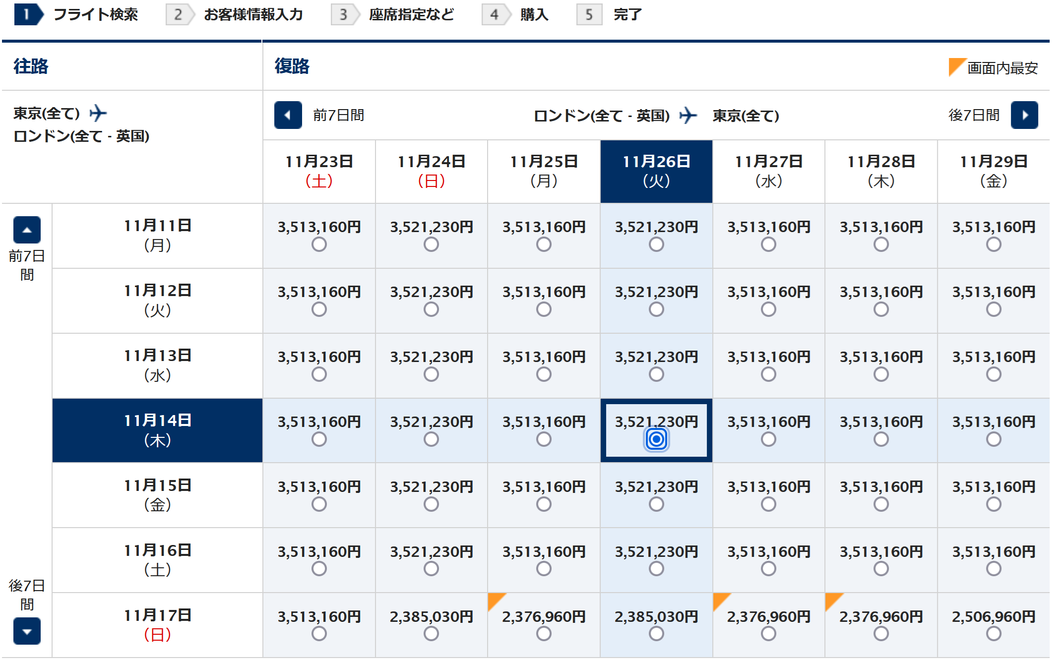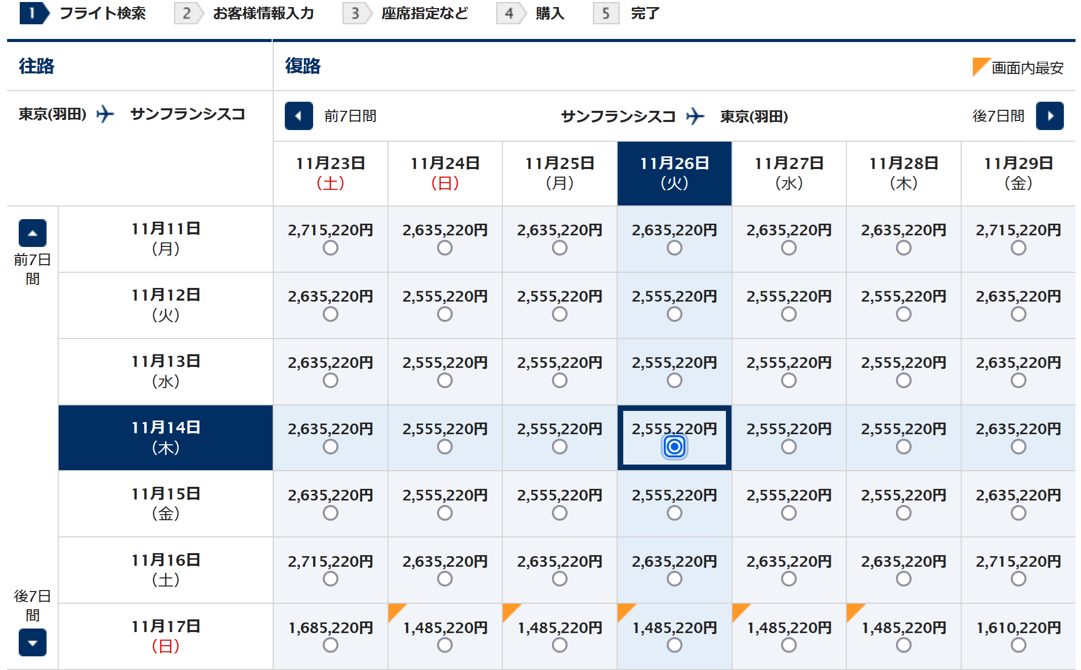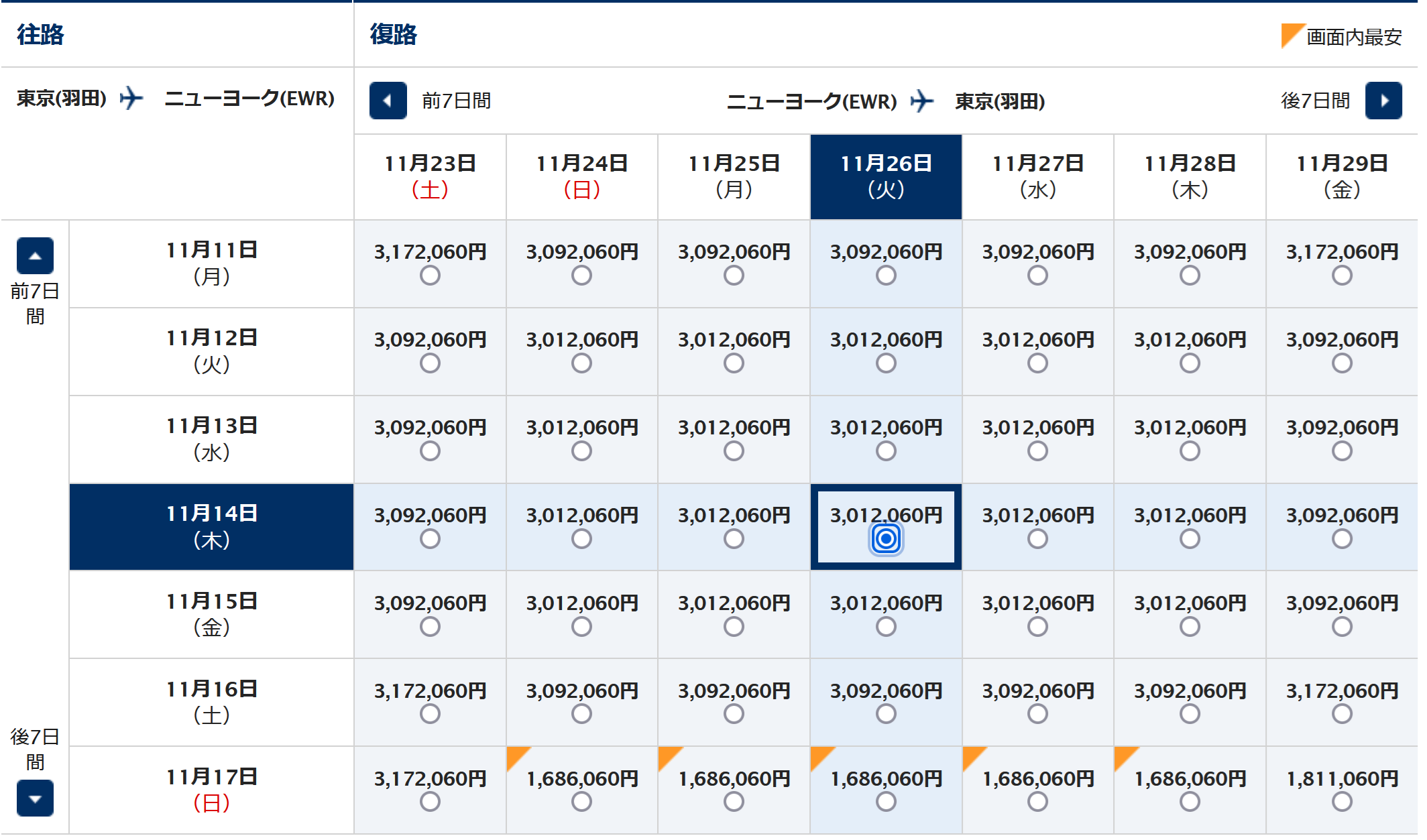 どの便も一部安い価格が表示されていますが、これは別の航空会社で乗り継ぎありなので除外してください。
